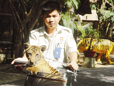 Chú Bi ngoan ngoãn ngồi trên giỏ xe đạp. Anh công nhân nói: “Chúng tôi có 4 con hổ thuộc thế hệ F2 như thế này”.