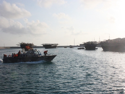 Bộ đội hải quân Việt Nam giúp ngư dân neo đậu trong âu tàu đảo Song Tử Tây thuộc quần đảo Trường Sa.
