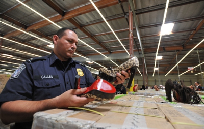 Chỉ vào hàng loạt những đôi giầy toàn một mầu đế đỏ chói, bà Lee Harty, một nhân viên khác của CBP, giải thích rằng đây là lần đầu tiên CBP thấy loại giầy có dấu hiệu vương giả này đến cảng Long Beach.