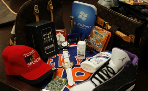 Các mặt hàng giả bị nhà chức trách Mỹ tịch thu được mang ra trưng bày - Ảnh: Reuters