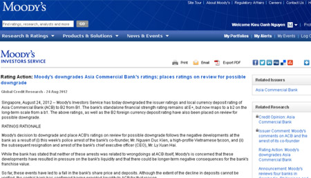 “Dù ACB đă tuyên bố cả hai vụ bắt giữ trên không có liên quan tới ngân hàng này, Moody’s lo ngại rằng, những diễn biến này đă gây áp lực lên thanh khoản và có thể tạo ra những ảnh hưởng tiêu cực dài hạn tới giá trị kinh doanh của ACB”, thông báo của Moody’s có đoạn viết.