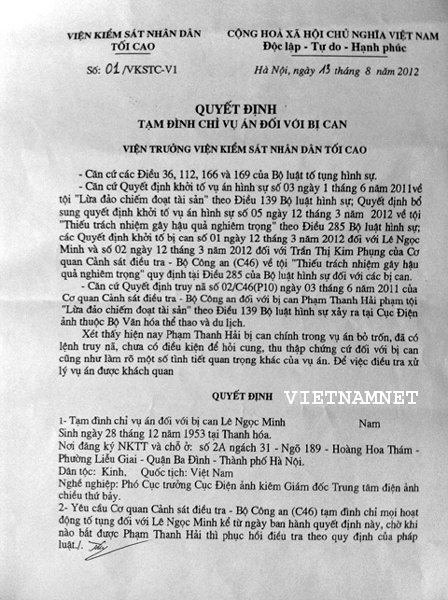 3) Điều 2 của quyết định ghi: “Yêu cầu Cơ quan Cảnh sát điều tra – Bộ Công An (C46) tạm đ́nh chỉ mọi hoạt động tố tụng đối với Lê Ngọc Minh kể từ ngày ban hành quyết định này, chờ khi nào bắt được Phạm Thanh Hải th́ phục hồi điều tra theo quy định của pháp luật”.