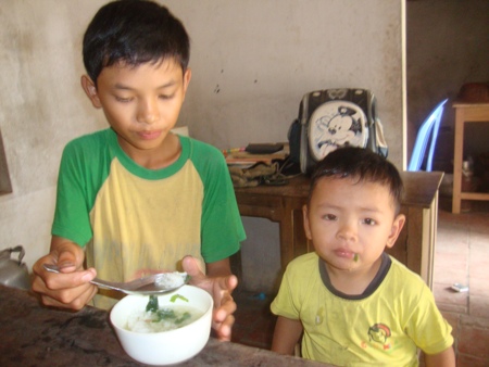 Tuy Tín mới học lớp 6 nhưng ngày nào cũng vậy, cứ buổi sáng đi chăn bò giúp hàng xóm rồi tập tành nấu cơm, tắm rửa giặt đồ cho em thay anh cả khi không có anh ở nhà.