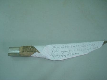 | Con dao mà Long khắc hai chữ hận tình lên cán rồi dùng đâm chết vợ và anh vợ |