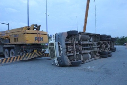 Phóng xe tốc độ cao, container hạng nặng lật giữa ngã tư