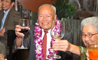 Cụ Thái Lân, 88 tuổi, cựu tổng thư ký nhật báo Chính Luận, cụng ly với bạn bè làng báo trong buổi họp mặt tại nhà hàng Brodard Chateau một buổi tối Thứ Bẩy cuối Tháng Chín. (Hình: Dân Huỳnh/Người Việt)