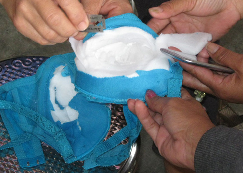| Trong nhiều chiếc áo ngực Trung Quốc, người tiêu dùng phát hiện có loại thuốc trắng lạ. Ảnh: Chí Phan. |