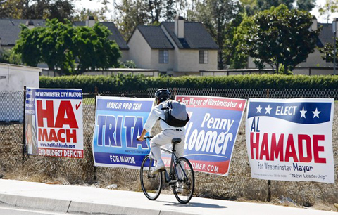 Biển hiệu vận động tranh cử chức thị trưởng thành phố trên đường phố Westminster. Ảnh: Los Angeles Times