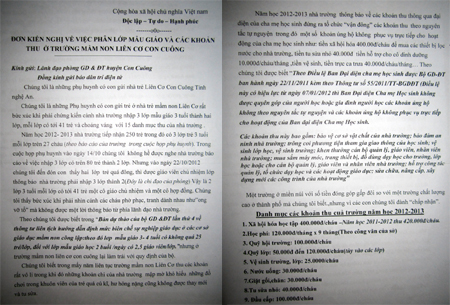 Theo đó, tiền vận động xă hội hóa giáo dục được “vận động” thu với mức sàn cao, 400.000đ/cháu và 250.000đ/cháu (hộ nghèo). Tiền mua đồ chơi, sách vở đồ dùng học tập thu 168.000đ/cháu. Ngoài ra, trường c̣n thu thêm tiền trang trí lớp học theo chủ điểm là 160.000đ/cháu; Tiền quỹ lớp 50.000đ đến 120.000đ/cháu (tùy vào các lớp); Tiền quỹ hội lớp 50.000đ đến 100.000đ/cháu (tùy vào các lớp); Tiền quỹ hội trường 100.000đ/cháu; Tiền vệ sinh trường, lớp 25.000đ/cháu; Tiền giặt gối, chăn 30.000đ/cháu; Tiền nước uống 30.000đ/cháu; Tiền ăn 15.000đ/cháu/ngày; Tu sửa nhỏ 40.000đ/cháu; Tiền đầu cấp 100.000đ/cháu; Tiền trực ca trưa 40.000đ/cháu/tháng x 9 tháng; Tiền hỗ trợ cô dinh dưỡng 10.000đ/cháu/tháng x 9 tháng.