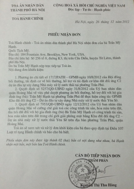 | Cụ thể, Ṭa Hành chính - TAND TP. Hà Nội đă nhận đơn của bà Trần Mỹ Hạnh, quốc tịch Mỹ, địa chỉ 184 Fountain Ave, Brooklyn, New York, USA, địa chỉ liên hệ: số 256, tổ 8, đường K3, thị trấn Cầu Diễn, huyện Từ Liêm, TP. Hà Nội. Bà Trần Thị Mỹ Hạnh đă trực tiếp đến TAND TP. Hà Nội nộp đơn khởi kiện và các văn bản liên quan.
