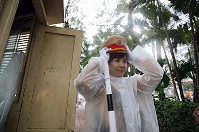 Nữ cảnh sát giao thông xuống phố ngày mưa rét