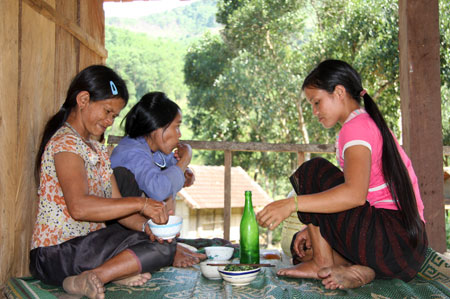 Thế nhưng, không chỉ thanh niên ở đây nhậu, mà trên một góc nhà sàn bên cạnh, ba người phụ nữ cũng nghiêng ngả cùng chai rượu gạo trắng, trước mặt là một tô rau xanh và không hề dùng đũa mà lấy tay bốc lấy thức ăn.