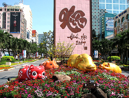 Những chú heo đất là biểu tượng của đường hoa Nguyễn Huệ Tết Định Hợi 2007. Ảnh: Ban tổ chức.