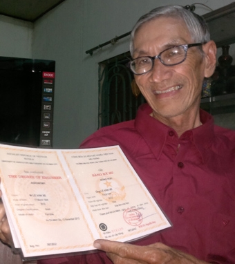 Niềm vui sắp bước sang tuổi “thất thập cổ lai hi” của ông Lê Văn Xê ở ấp Bình Cang 1, xã Bình Thạnh, huyện Thủ Thừa, Long An là tấm bằng kỹ sư nông học loại khá của Trường đại học Nông lâm TP.HCM.