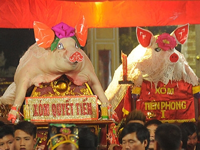 Hội làng diễn ra vào ngày mùng 7-1 âm lịch thì ngay từ ngày mùng 5, những “ông lợn” đã được gia chủ tắm rửa sạch sẽ và cho ăn thật no. Vào ngày mùng 6, ông đám phải làm sao để “ông lợn” tự đi ra đình làng mà không phải bắt đi hay khênh đi. Sau khi đã đưa được “ông lợn” ra đình thì dùng dây cột “ông” lại để đến sáng hôm sau làm lễ.