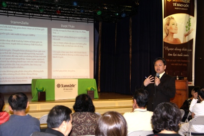 Bác Sĩ Vũ Hồ, đại diện công ty StammZelle, giới thiệu cho người tham dự sự kỳ diệu của StammZelle Tế Bào Gốc. (Hình: Ngọc Lan/Người Việt)