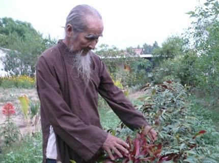 Cụ Mười bên cây thảo dược tự trồng.