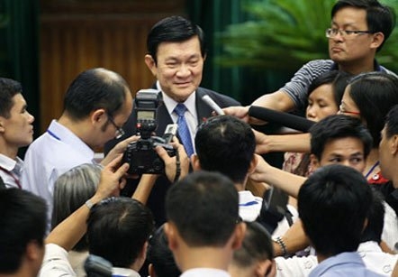 Chủ tịch nước Trương Tấn Sang trong ṿng vây báo chí sau khi được Quốc hội bầu, tháng 7/2011. Ảnh: Lê Anh Dũng