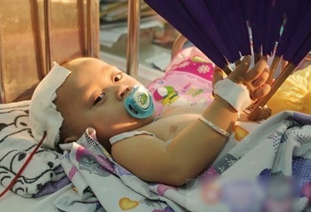 Thấy bé cười thích thú, người cha trẻ phấn khởi tung bé lên cao hơn nhưng chẳng may va vào chiếc quạt trần đang quay. Hậu quả là cháu bé bị nứt sọ với chiều dài 12cm, chảy máu rất nhiều và dập não. Bác sĩ đã tiến hành cắt lọc, làm sạch vết thương, cầm máu và vá chỗ bị nứt.