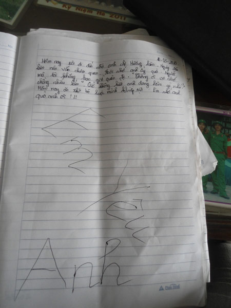 Vừa nói chuyện, anh Trưởng vừa đưa cho chúng tôi một cuốn vở có mấy trang nhật kí mà Hằng viết trước ngày bị sát hại. Lật từng trang nhật kí, chúng tôi cảm nhận được phần nào t́nh cảm chân thật, ngây ngô của cô bé. Chữ “Em yêu anh” cô bé để hết một trang vở. Đọc trang cuối cùng mà em viết khi biết ḿnh mang thaikhiến cho người xem không thể cầm được nước mắt. Chúng tôi xin trích nguyên văn ḍng nhật kư:
