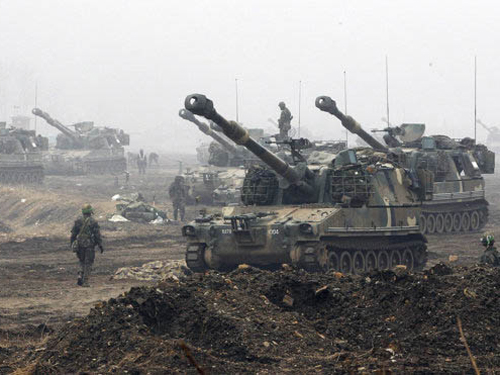 Pháo tự hành K/55 của thủy quân lục chiến Hàn Quốc diễn tập gần biên giới với Triều Tiên. Ảnh: AP