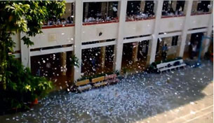 Học sinh trường PTTH Nguyễn Hiền ở Sài Gòn xé giấy được coi là đáp án thi sử ném xuống sân trường để ăn mừng hôm 30/3/2013. Screen capture.