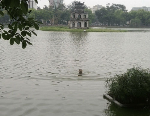 Dân hiếu kỳ xem nam thanh niên bơi cùng cụ rùa Hồ Gươm