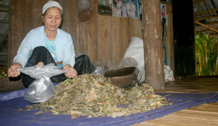 Thấy chúng tôi, mế Tiến đem chiếc ô ra đầu cổng đón vào nhà. Lúc này trong nhà mế Tiến cũng có 4 người đă vượt hàng trăm cây số từ Sơn La đến để xin thuốc chữa viêm phổi măn tính. Đôi tay thoăn thoắt phân loại, gói ghém, mế Tiến bảo chúng tôi kiên nhẫn chờ đợi để xử lư xong cho từng người ở xa kịp lấy thuốc mang về. Măi khi người bệnh đă đi hết, mế mới trở lại ngồi cùng chúng tôi. Rót bát nước lá rừng mời khách rồi mế mở lời: “Các chú thấy đấy! Ngày nào nhà tôi cũng có người đến xin thuốc, mà mấy hôm nay trời mưa không phơi được thuốc, thành thử nhiều người đến không có thuốc lại phải ra về, thấy mà tội nghiệp”.
