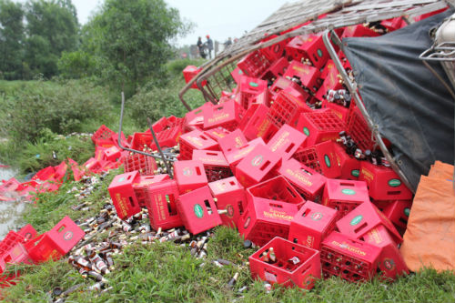Xe tải chở 1.300 thùng bia lật úp dưới ruộng