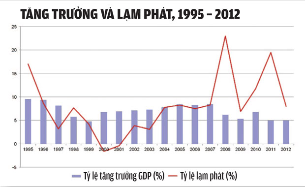 Dữ liệu tăng trưởng và lạm phát giai đoạn 1995 – 2012 cho thấy, nền kinh tế Việt Nam sau một thập niên phát triển ở mức cao với trung bình 10%/năm thì năm 2007 kinh tế bắt đầu giảm dần, xuống mức khoảng 5%. Theo TS Thành, bất ổn kinh tế vĩ mô manh nha từ những năm đầu thập niên 2000, chỉ số lạm phát có lúc tăng đến hơn 20%, con số lạm phát này là quá trình tích luỹ chịu sự tác động của chính sách tín dụng dễ dãi.