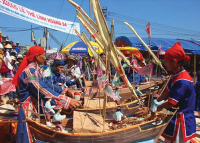 Chuẩn bị thả thuyền tế những tiền nhân từng ra khơi giữ Hoàng Sa trong “Lễ khao lề thế lính” tại huyện đảo Lý Sơn, Quảng Ngãi.(Hình: Internet)