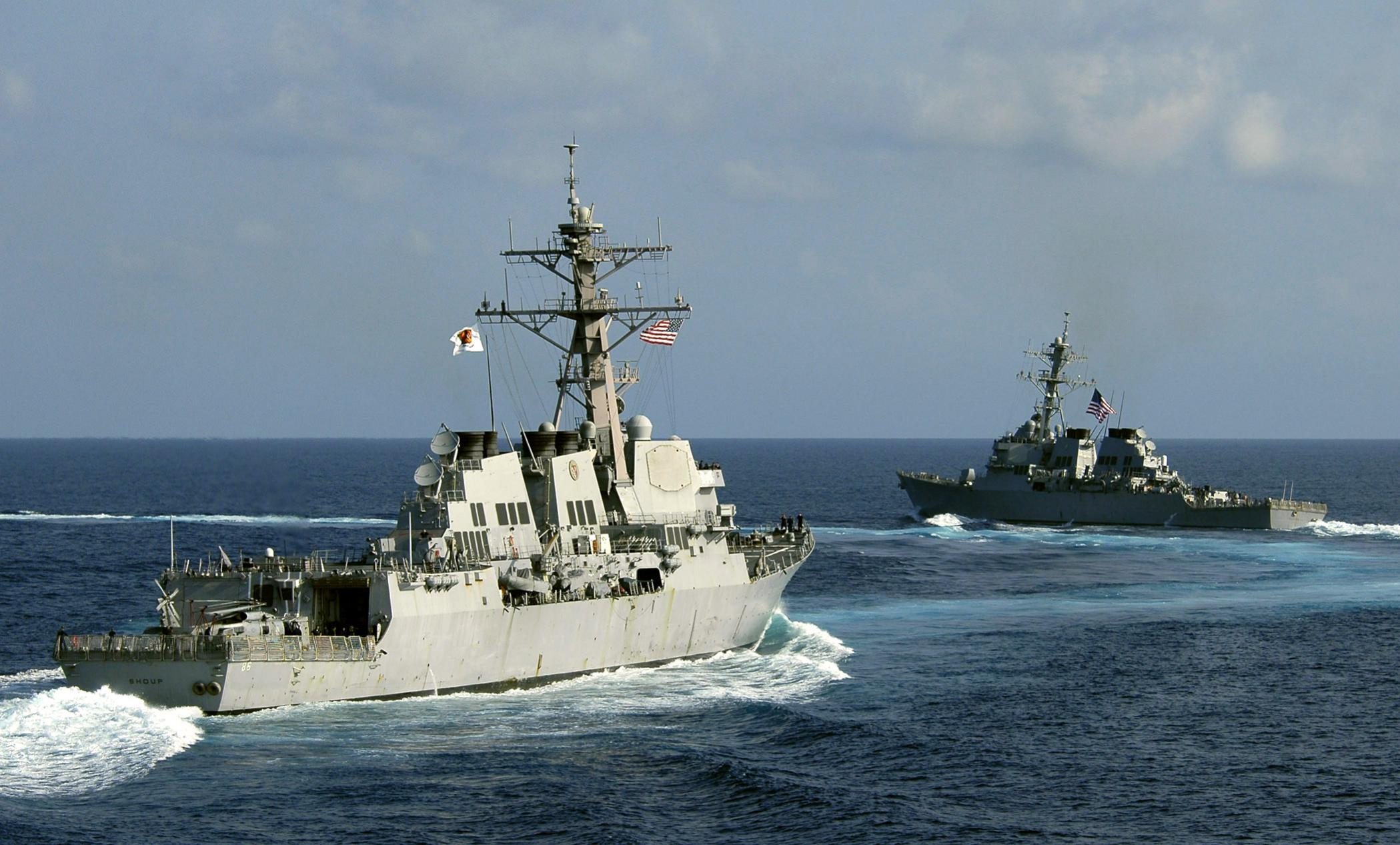 | Các tàu chiến USS Shoup và USS_Russell của Mỹ di chuyển trên Biển Đông. |