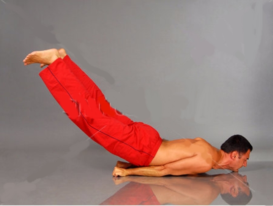 - Châu chấu: Nằm sấp xuống sàn, mặt nghiêng sang một bên; chân duỗi thẳng, mu bàn chân úp xuống đất; tay duỗi thẳng theo thân, hai bàn tay nắm lại để phía ngón cái xuống đất. Hít sâu vào và nâng dần cả hai chân lên cao, trong khi hai bàn chân vẫn chạm nhau. Giữ nguyên tư thế đó khoảng 30 giây thì thở ra và từ từ hạ chân xuống như tư thế ban đầu. Lặp lại 10 lần.