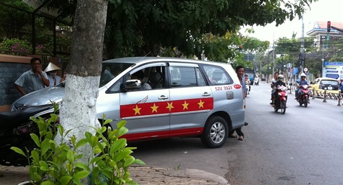 Xe dán cờ lạ chạy khắp phố ở Tiền Giang