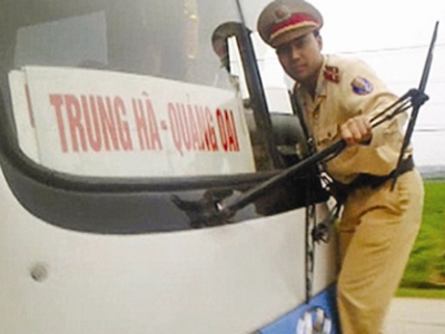 Một chiến sĩ CSGT đu bám vào cần gạt nước xe khách để tránh cú đâm trực diện.