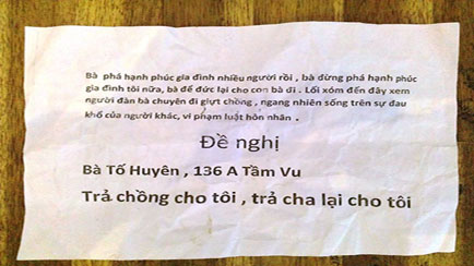 Ngoài ra, theo người dân ở khu phố này, người đàn bà này cũng từng in một số tờ “giấy đòi chồng” dán trước cửa nhà của “tình địch” cách đó chỉ vài ngày. Nhưng số giấy này đã bị bà H. xé bỏ hết. Một nguồn tin còn khẳng định, cách đây gần 1 tuần, trong lúc đến đây dán “giấy đòi chồng”, người đàn bà lạ này còn bị em trai bà H. từ trong nhà ra ra hăm dọa cho người hành hung bà này nếu còn tiếp tục quấy rối gia đình. Nhưng người đàn bà này kiên quyết không bỏ đi.