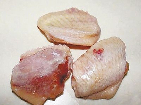 Gia đình ông Cổ khi mua loại cánh gà này về luộc một lúc lâu, da bên ngoài chín, nhưng bên trong vẫn đỏ máu. Cho vào nồi hầm, vớt ra thấy thịt có chất keo trong suốt ăn nhạt toẹt. Thấy vậy ông không ăn. Một số người ăn sau đó đều bị đau bụng.