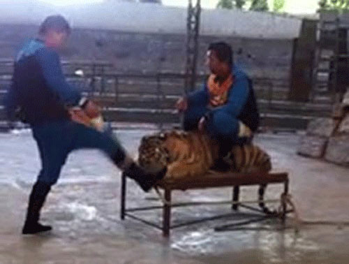 Đoạn clip cho thấy một nhân viên ngồi nhún nhảy trên lưng hổ trong khi người còn lại đạp vào mặt hổ.