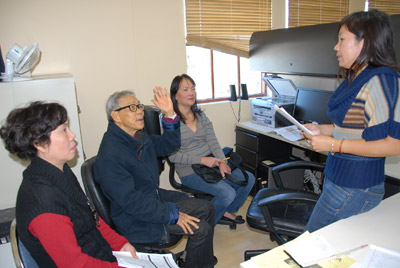 Một sinh viên đang theo học ngành luật, không muốn nêu tên, cho biết: “Một số đồng hương lớn tuổi không rành tiếng Anh mà đơn từ đều bằng tiếng Anh nên không biết phải điền như thế nào. Một số khác th́ hiểu tiếng Anh, nhưng lại không rành về computer nên cũng không làm sao mà điền được đơn cho ḿnh theo mẫu được phổ biến trên các Web. Chúng tôi giúp cho từng người. Mỗi người khi đến sẽ được phát cho một mẫu đơn in sẵn, chúng tôi giúp điền vào từng phần. Mọi người dùng bút ch́ để điền, khi hoàn tất, các luật sư cố vấn thấy hợp lệ mới đánh vào computer để in ra. Trung b́nh mỗi người chúng tôi mất khoảng 45 phút hướng dẫn.”