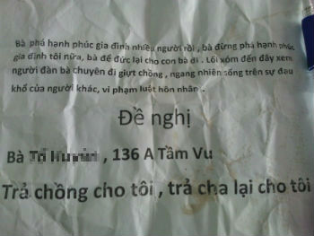 Nội dung tờ rơi như sau: “Bà phá hoại hạnh phúc gia đ́nh nhiều người rồi, bà đừng phá hạnh phúc gia đ́nh tôi nữa, bà để đức lại cho con bà đi. Lối xóm đến đây xem người đàn bà chuyên đi giựt chồng, ngang nhiên sống trên sự đau khổ của người khác, vi phạm luật hôn nhân. Đề nghị bà Tố, đường Tầm Vu trả chồng cho tôi, trả con cho tôi”.