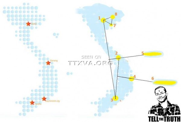 Tất nhiên, chúng ta đang nói đến việc ghi nhớ “ang áng” nên các vị trí này không hoàn toàn chính xác 100% như thực tế, cách dễ nhất là các bạn hăy coi trên diadiem.com (v́ trang này ghi đích danh rằng Quần đảo Hoàng Sa – Đà Nẵng, Việt Nam và quần đảo Trường Sa – Khánh Ḥa, Việt Nam). Và nên nhớ, bài này được viết ra để hướng dẫn các bạn xác định vị trí Hoàng Sa, Trường Sa chứ không phải dạy các bạn vẽ bản đồ nên đừng vào thắc mắc Phú Quốc, Cô Tô, Trà Bản, Thượng Mai, Hạ Mai, Vạn Cảnh, Tuần Châu… đang ở chỗ nào trên tấm bản đồ.