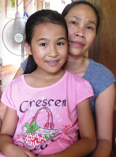 Chị Xuyến và con gái út của chồng với vợ hai. Hiện cô bé 10 tuổi này cũng do chị chăm sóc. Ảnh: Hoàng Phương.