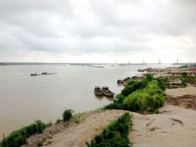| Ngay cạnh cầu Thăng Long và hệ thống bờ kè nắn ḍng chảy sông Hồng, từ lâu nay vẫn mọc lên các băi tập kết cát. |