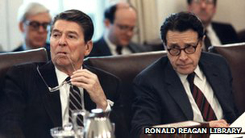 Cựu Tổng thống Ronald Reaga (trái) và cựu Bộ trưởng quốc pḥng Caspar Weinberger