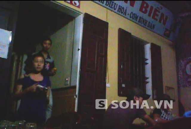 Cô gái vừa đi khách xong từ trong ra lại tiếp tục được người thanh niên phía sau điều sang một quán khác tại bãi biển Quất Lâm (Nam Định).
