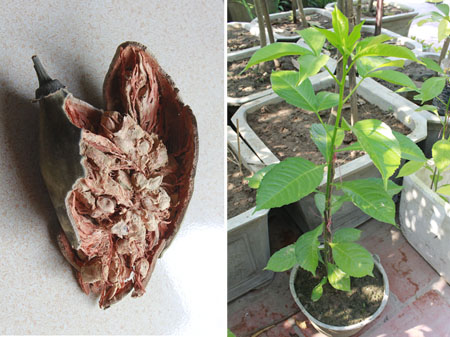 “Sau khi mang quả bao báp từ Huế về chúng tôi cứ thế cho vào chậu cây cảnh. Không lâu sau đó thì vỏ quả bao báp nứt ra, bên trong có hơn một trăm hạt nảy mầm. Tôi và mọi người bóc tách hạt đưa vào các túi ni-lông đựng cát trộn với đất. Từ lúc hạt nảy mầm cho tới bây giờ (cây cao 1,5m) chúng tôi chỉ tưới nước cho cây và không hề bón bất cứ một loại phân nào vì sợ cây chết”, anh Ngọc cho hay.