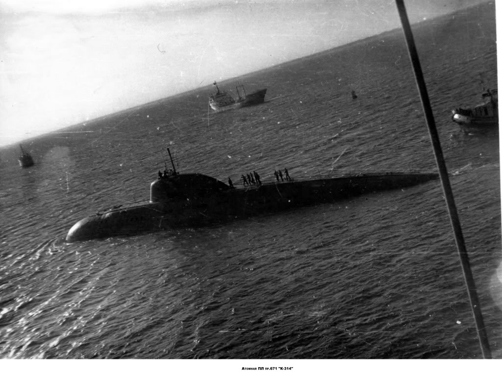 "K-314" đề án 671-V, mùa hè 1985, nổi "phềnh" giữa vịnh Cam Ranh. Đây là tàu đã va chạm lúc nổi lên để quan sát với tàu sân bay "Kitty Hawk" tại biển Nhật Bản ngày 21/3/1984, khi đó "K-314" đang theo dõi nhóm tàu chiến Mỹ tập trận "Tinh thần đồng đội-84" cùng quân đội Hàn quốc. Cả hai tàu bị thương nhẹ, một cánh quạt bánh lái "K-314" mắc vào thân tàu "Kitty Hawk". Tàu "K-314" không lặn được nữa và được tàu săn ngầm và chống hạm cỡ lớn "Vladivostok" kè về căn cứ cơ bản để sửa chữa. Ảnh trên chụp sau khi tàu sửa chữa xong và tiếp tục đi làm nhiệm vụ.