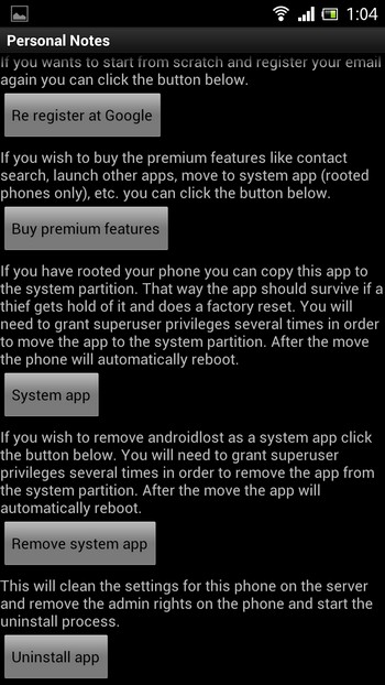 Sau khi cài đặt, ứng dụng sẽ có tên gọi “Personal Notes” thay vì “Android Lost” và biểu tượng là một cuốn sổ, như biểu tượng của một ứng dụng ghi chú. Thực ra đây là cách để nhằm qua mặt những tên trộm lấy cắp điện thoại của bạn, để chúng không hay biết thiết bị đã có cài đặt ứng dụng chống trộm.