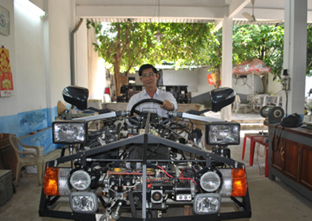 Rồi anh vui vẻ kể thêm: "Biết tôi mê làm xe quá vợ tôi bảo sẽ mua cho tôi chiếc xe hơi với điều kiện tôi phải bỏ chiếc xe đang làm dở dang. Nghe vợ nói nên tôi đùa rằng sẽ tháo chiếc xe mới lấy động cơ bỏ vào chiếc xe này thì vợ tôi không đồng ý. Tôi chỉ đùa vậy với cô ấy để cô ấy bỏ ý định và cho tôi làm tiếp mà thôi. Với lại nếu làm vậy thì không ra chiếc xe lội nước do tôi thiết kế".