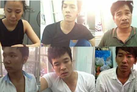 Sáu đối tượng trong nhóm giang hồ bắt cóc chị Tr. tại cơ quan công an.